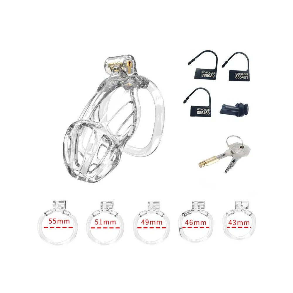 The opening at the front of each P-Cage allows the wearer to urinate without removing the cage. This penis cage set includes 5 rings in different sizes, ranging between 43 – 55 mm. In addition, it includes 1 copper built-in lock and 3 plastic numbered padlocks. The plastic locks can be cut off with scissors after a single use. Finally, one plastic screw is included as an alternative to the copper built-in lock, which may not pass airport security checks, while the plastic lock is airport-friendly.
