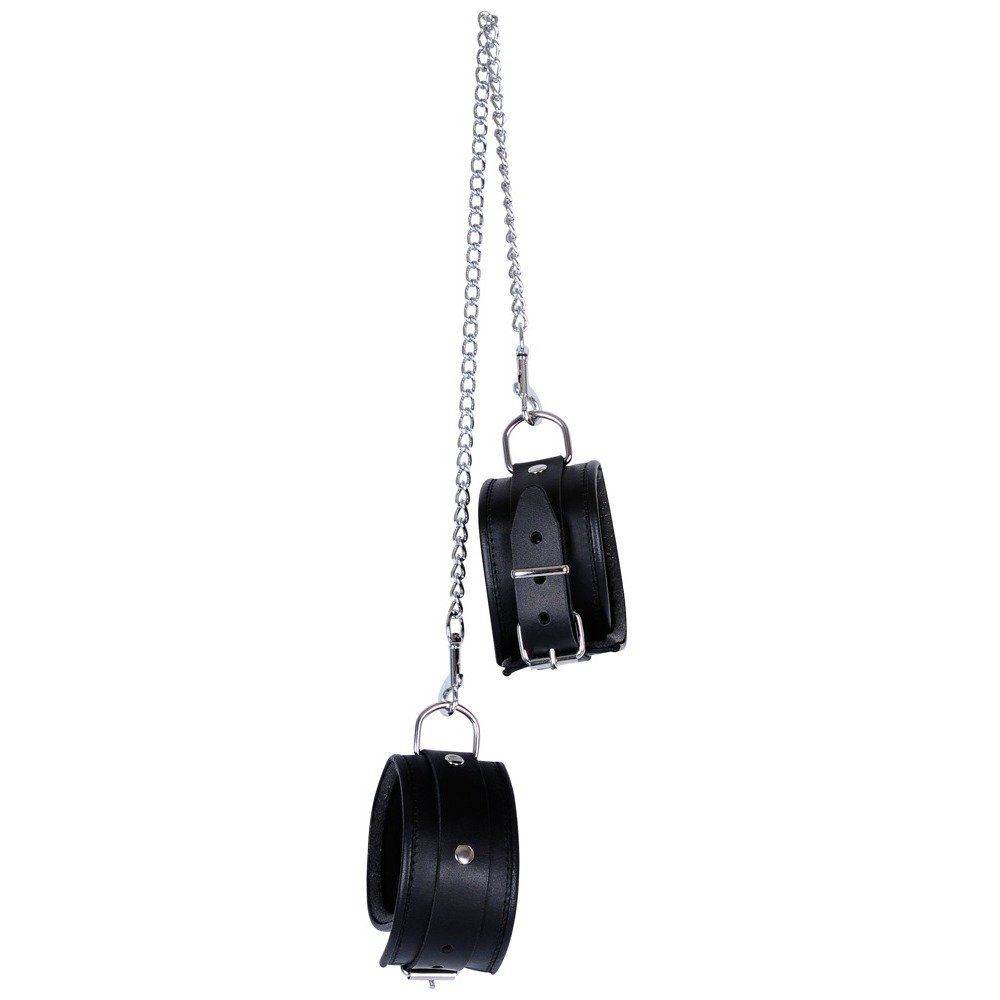 Leather ankle cuffs, padded and edge-trimmed. Connected by heavy-duty curb chromed curb chain.