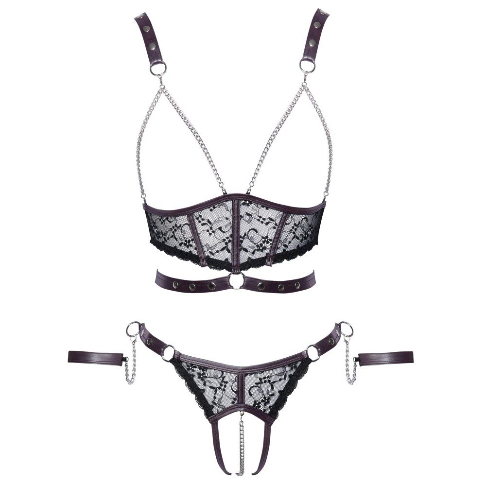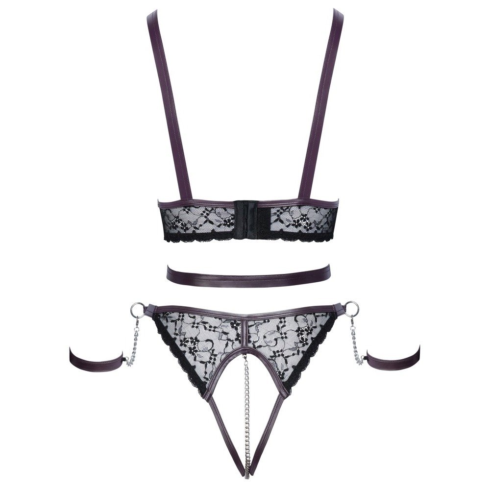 Open set by Cottelli BONDAGE with a top with no breasts, open crotch briefs and two soft handcuffs. Stylish mix of fine black lace with dark purple matte look details and silver accessories. The top frames the free breasts with chains.