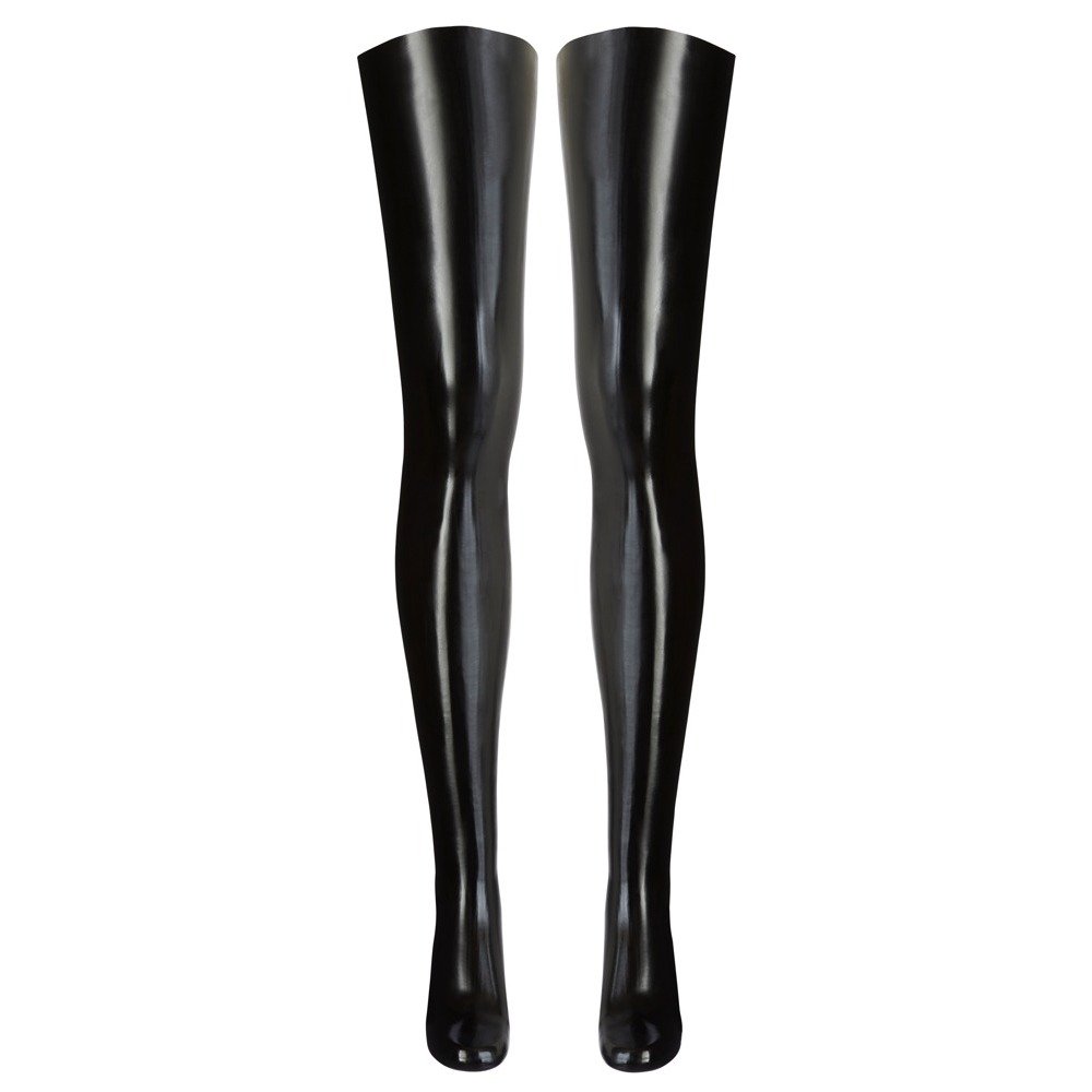 Skinny, thigh high, dipped latex stockings in black. Without shoes.