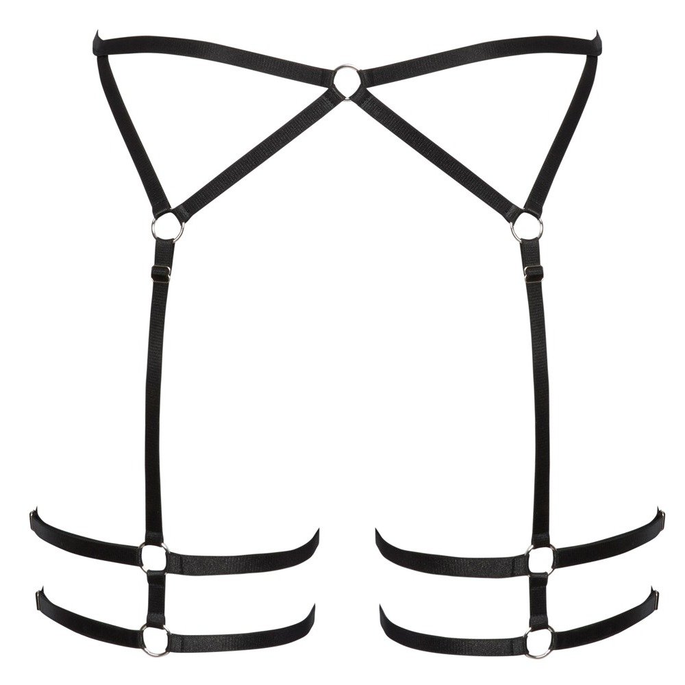 This black suspender belt from Cottelli LINGERIE shows off the waist, hips and thighs in an exciting way! Made from soft, silky, shiny stretch straps and silver-coloured connecting rings. The suspender straps at the front and back and the double thigh straps can be adjusted to fit.