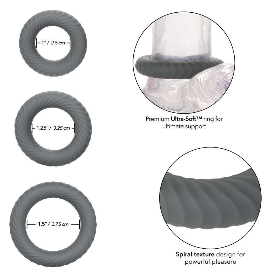 Each cock ring in this gradually increased in size with a spiral texture pattern for a sensational experience with every wear. These uniquely textured cock rings are made to increase stamina, improve sensitivity and deliver thrilling erection support.
